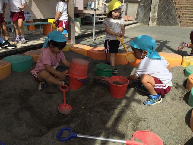 「お砂をザクザク。バケツに詰めるよ。」